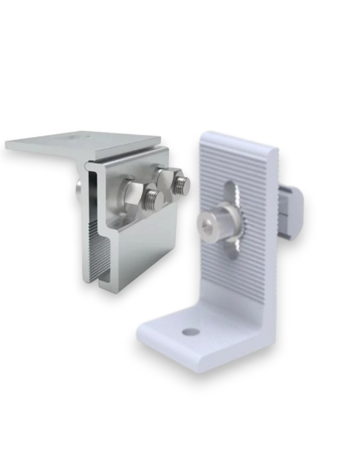 Clemă fixare pe tablă faltuită, include profil L + bolt. Sistem rapid de fixare fără perforare tablă — se prinde direct pe faltul (muchia) tablei. LP.