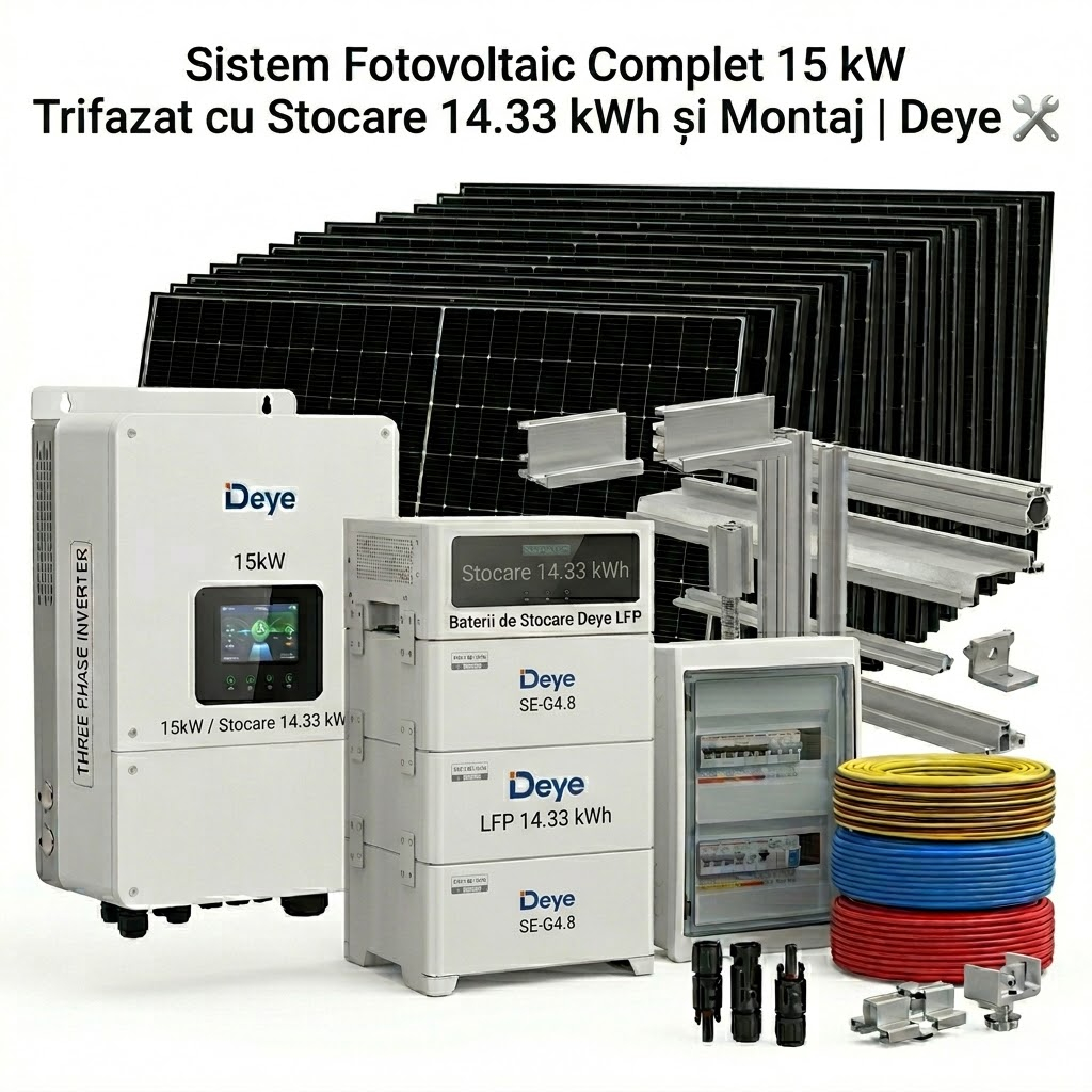 Sistem fotovoltaic complet 15 kW trifazat cu stocare 14.33 kWh si montaj inclus. Invertor hibrid Deye 15KW trifazat LV, panouri Longi / Jinko / JA Solar, baterie LiFePO4 14.33 kWh LV, structura de montaj, cabluri, tablou siguranta si toate accesoriile necesare. Montaj autorizat ANRE in toata tara, in 3-5 zile lucratoare.