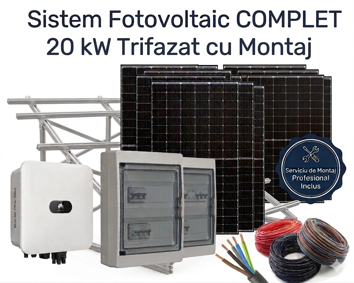 Sistem fotovoltaic complet 20 kW trifazat cu montaj inclus. Invertor Huawei 20KW trifazat, panouri premium Jinko / JA Solar / Longi, Smart Meter Huawei Trifazat, Dongle WiFi, structura de montaj, cabluri, tablou siguranta si toate accesoriile necesare. Montaj autorizat ANRE in toata tara, in 3-5 zile lucratoare.
