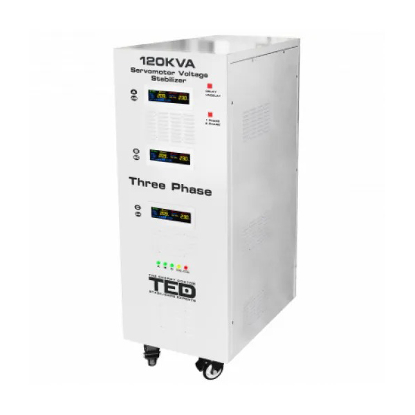 Stabilizator de tensiune trifazat cu servomotor (SVC SERVO), marca TED Electric, putere 120000VA / 84000W. Stabilizatorul protejeaza echipamentele electrice impotriva fluctuatiilor de tensiune din retea, mentinand o tensiune de iesire constanta si stabila. Caracteristici tehnice: - Putere: 120000VA / 84000W - Tip: Trifazat, SVC - Unda sinusoidala pura - Tensiune intrare: 242V-520V - Tensiune iesire: 380V - Frecventa: 50-60Hz / 50Hz - Eficienta: 98% - Transformator toroidal de inalta calitate - Tehnologia MCU Control Circuit pentru tensiune de iesire stabila - Timp de raspuns: < 1 secunda - Precizie reglare: ±1-3% - Functie DELAY selectabila: 6s / 180s (protectie compresoare) - Protectii: supratensiune, subtensiune, suprasarcina, supraincalzire, scurtcircuit - Alarma sonora (buzzer) - Display LCD digital cu afisare tensiune intrare/iesire - Conexiune intrare: Regleta - Conexiune iesire: Regleta - Carcasa metalica - Clasa protectie: IP20 - Dimensiuni: 900 x 550 x 1150 mm - Greutate: 220 kg - Temperatura functionare: 0°C ~ +40°C - Umiditate: 20% - 90% (fara condensare) - Garantie: 24 luni