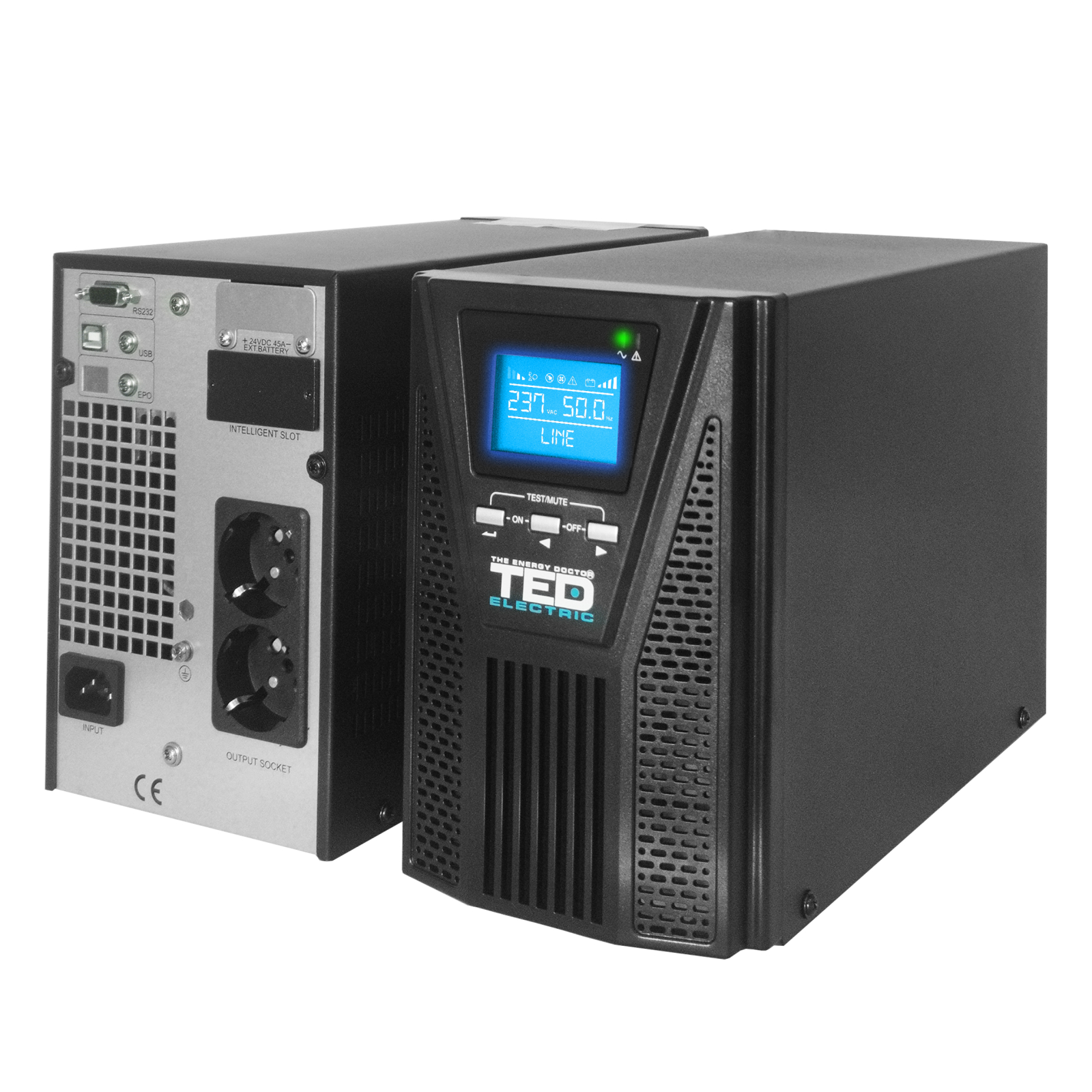Sursa neintreruptibila (UPS) Online cu dubla conversie TED Electric, 1000VA / 900W, monofazat, format tower. UPS-ul Online cu dubla conversie ofera cel mai inalt nivel de protectie a alimentarii electrice. Tensiunea este convertita continuu din AC in DC si inapoi in AC, asigurand o iesire perfect stabilizata cu unda sinusoidala pura, fara niciun timp de transfer. Ideal pentru servere, echipamente critice de retea, centre de date, echipamente medicale si instalatii industriale. Caracteristici tehnice: - Putere: 1000VA / 900W - Tip: Online Dubla Conversie (Double Conversion) - Topologie: monofazat - Format: tower - Forma unda iesire: Sinusoida Pura - Timp transfer: 0ms (conversie continua) - Factor de putere: 0.9 - Eficienta: > 90% - Acumulatori interni inclusi: 2x 12V 9Ah - Conectori iesire: 2x Schuko - Management: Da (USB/RS232/SNMP) - Bypass automat si manual - Pornire la rece (Cold Start): Da - Protectii: supratensiune, subtensiune, suprasarcina, scurtcircuit, supraincalzire - Alarma sonora: Da - Dimensiuni (L x l x H): 290 x 190 x 330 mm - Greutate: 12 kg - Temperatura functionare: 0°C - 40°C - Garantie: 24 luni
